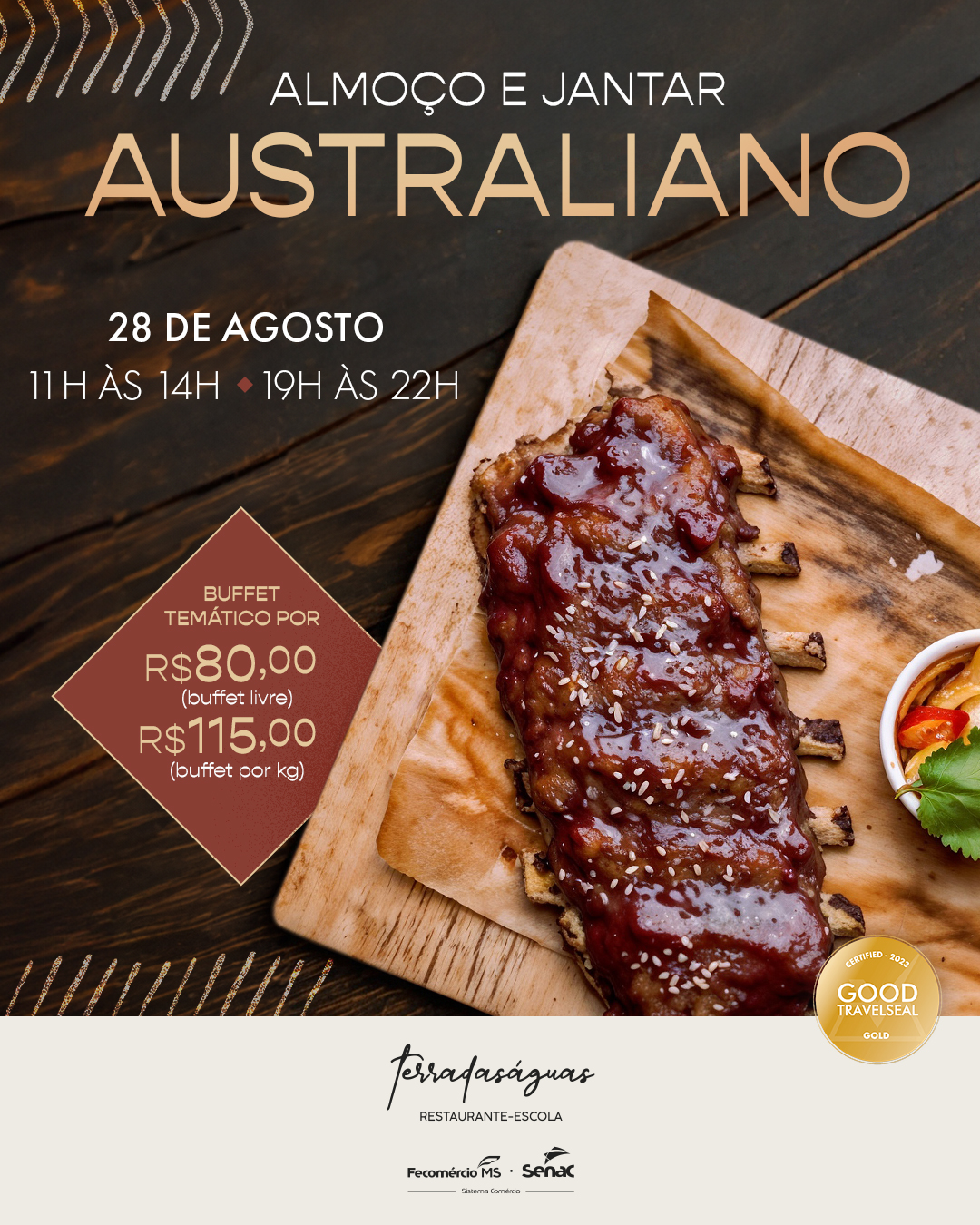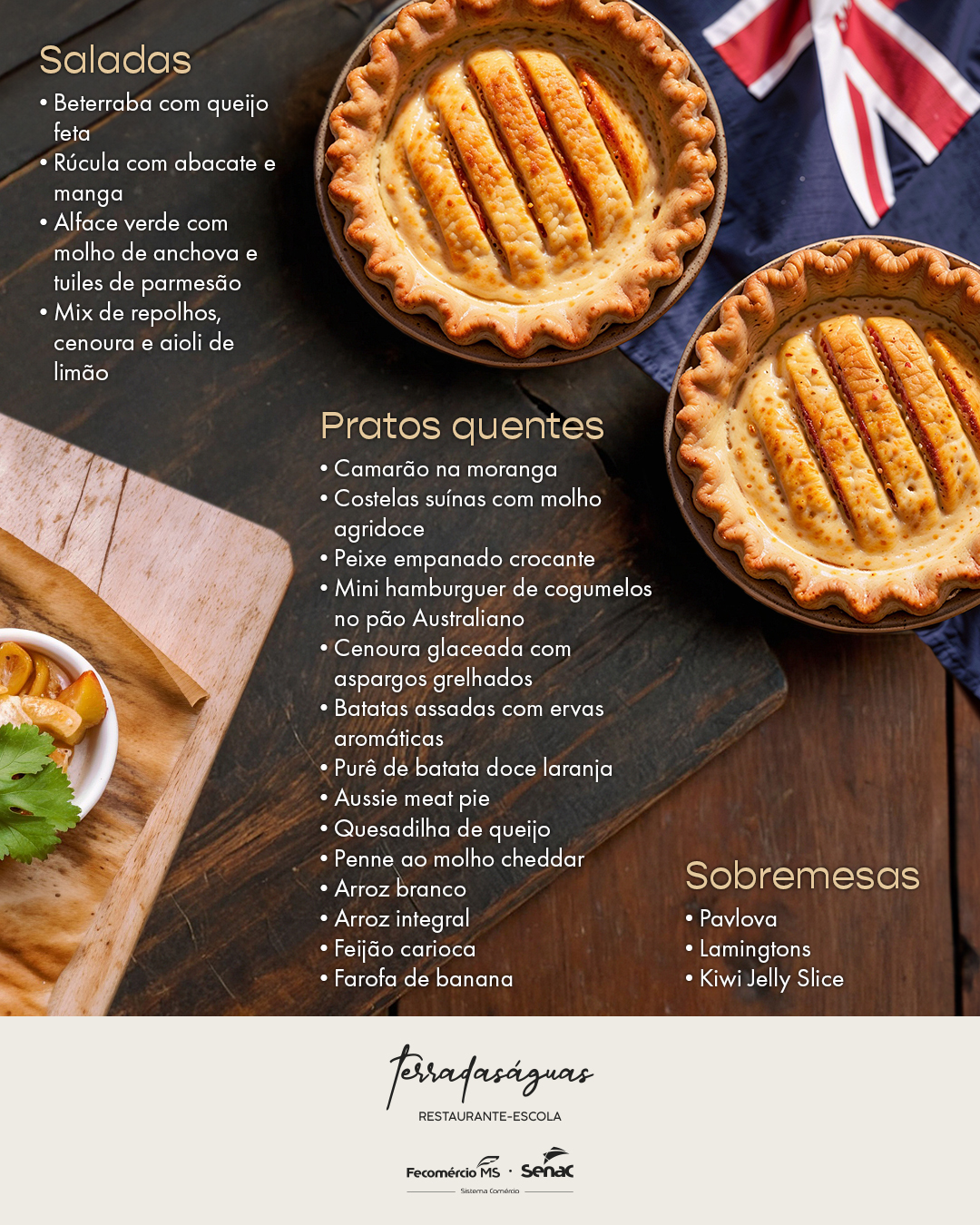 Com um menu preparado com o que há de melhor na culinária australiana, o restaurante-escola do Senac, o  terradaságuas, em Campo Grande, proporciona um dia de apreciação da gastronomia desta região, com destaque para os aromas e cores, no dia 28 de agosto, com almoço e jantar.