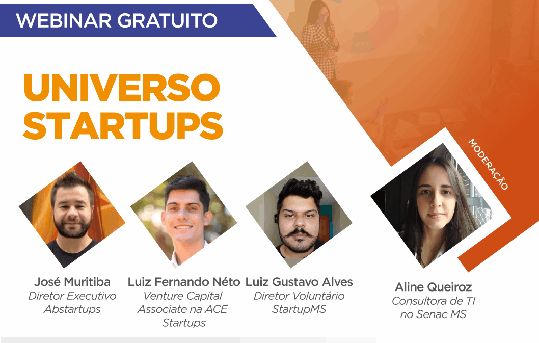 A consultora de TI do Senac MS, Aline Queiroz, e os convidados, o diretor voluntário da StartupMS, Luiz Gustavo Alves, o CEO e diretor executivo na Abstartups, José Muritiba, e o Venture Capital Associate na ACE Startups, Luiz Fernando Neto, vão falar sobre o processo de ideação até a captação de recursos para o desenvolvimento desse tipo de negócio. Além de mostrar como as associações podem auxiliar, inspirar, capacitar e conectar empreendedores a fim de construir o ambiente ideal para as startups transformarem o país. As inscrições devem ser feitas no link: https://bit.ly/3yLRbzD.