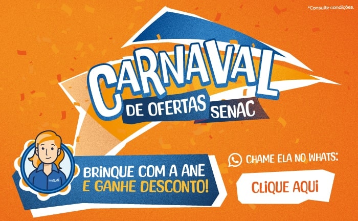 Mais informações no link: ms.senac.br/carnavaldeofertas ou pelo WhatsApp, no link: Share on WhatsApp.