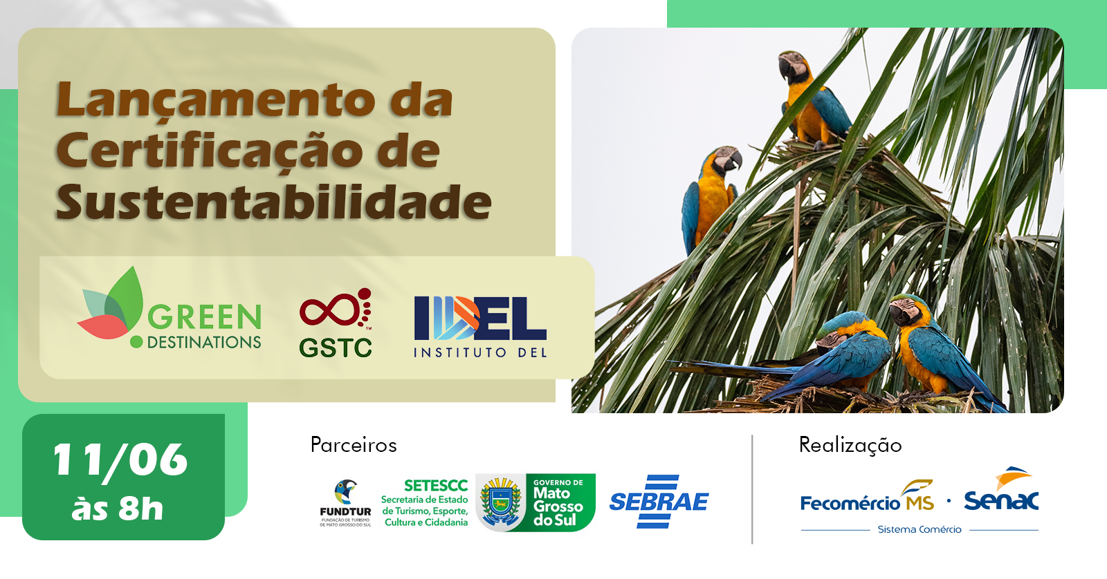 Empresários de Mato Grosso do Sul agora podem contar com consultorias que vão mapear e nortear práticas de sustentabilidade de empreendimentos turísticos, culminando em uma certificação internacional creditada pelo GSTC - Conselho Global de Turismo Sustentável. Trata-se do selo Good Travel Seal – da fundação holandesa, sem fins lucrativos Green Destinations. As consultorias serão guiadas pelo Senac MS, em parceria com o Del Turismo, Sebrae, Setescc e Fundtur. O lançamento foi nesta terça-feira, 11, no Senac Turismo e Gastronomia, e contou com representantes do segmento e representantes do Sistema Fecomércio MS.