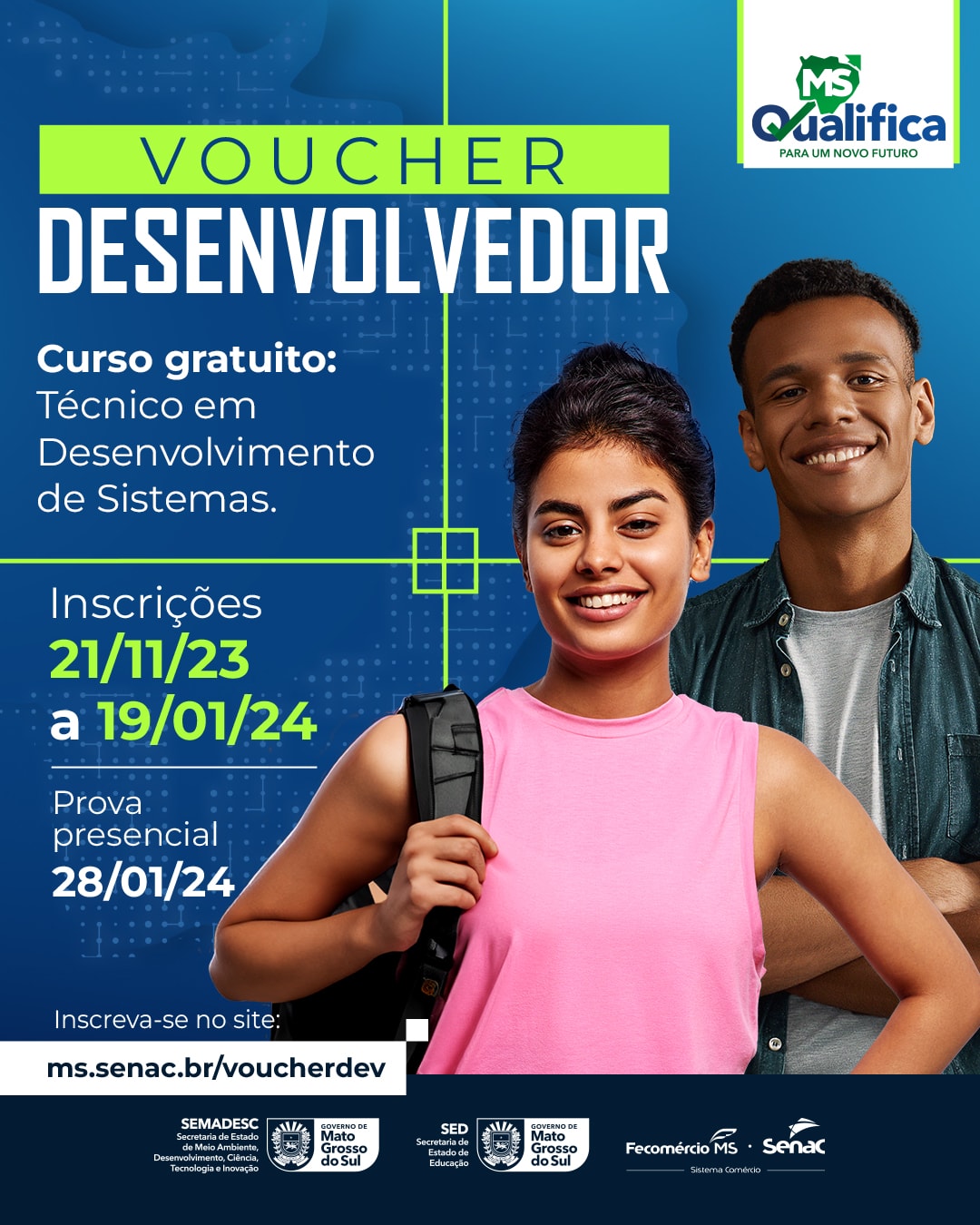 Quem quer iniciar uma formação em uma das áreas que mais crescem no País, a Tecnologia da Informação, tem a chance de garantir a oportunidade no programa "Voucher Desenvolvedor", que vai capacitar 540 pessoas, de forma gratuita, no curso Técnico em Desenvolvimento de Sistemas. O curso é oferecido em parceria entre o Senac MS e o governo do Estado, por meio da Secretaria de Meio Ambiente, Desenvolvimento, Ciência, Tecnologia e Inovação (Semadesc) e da Secretaria Estadual de Educação (SED).