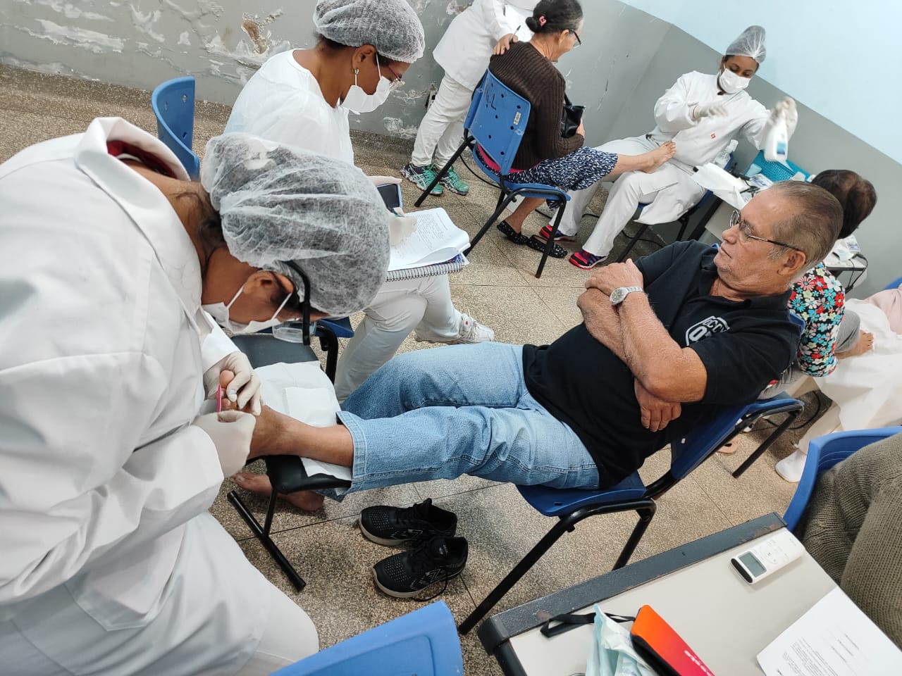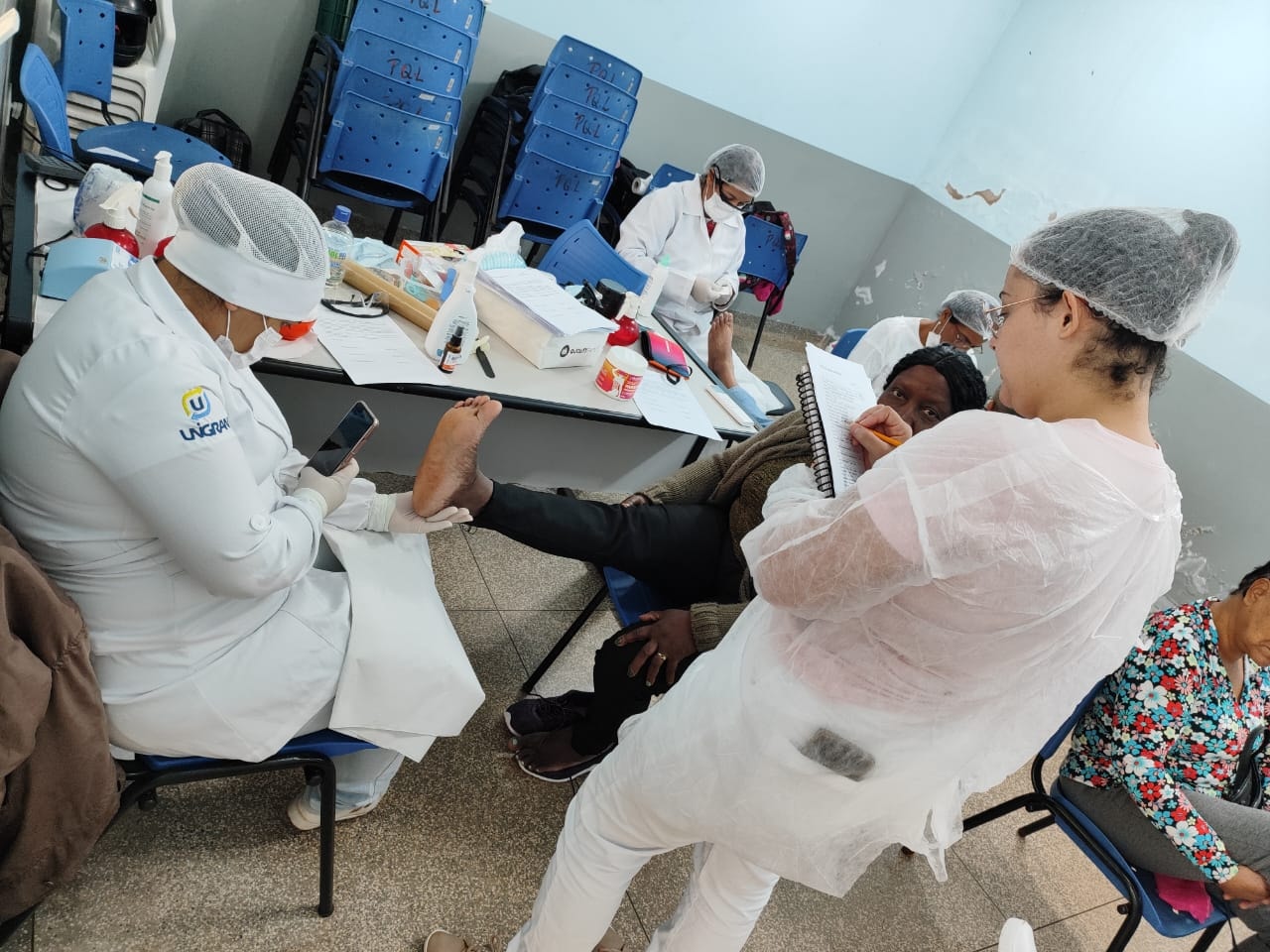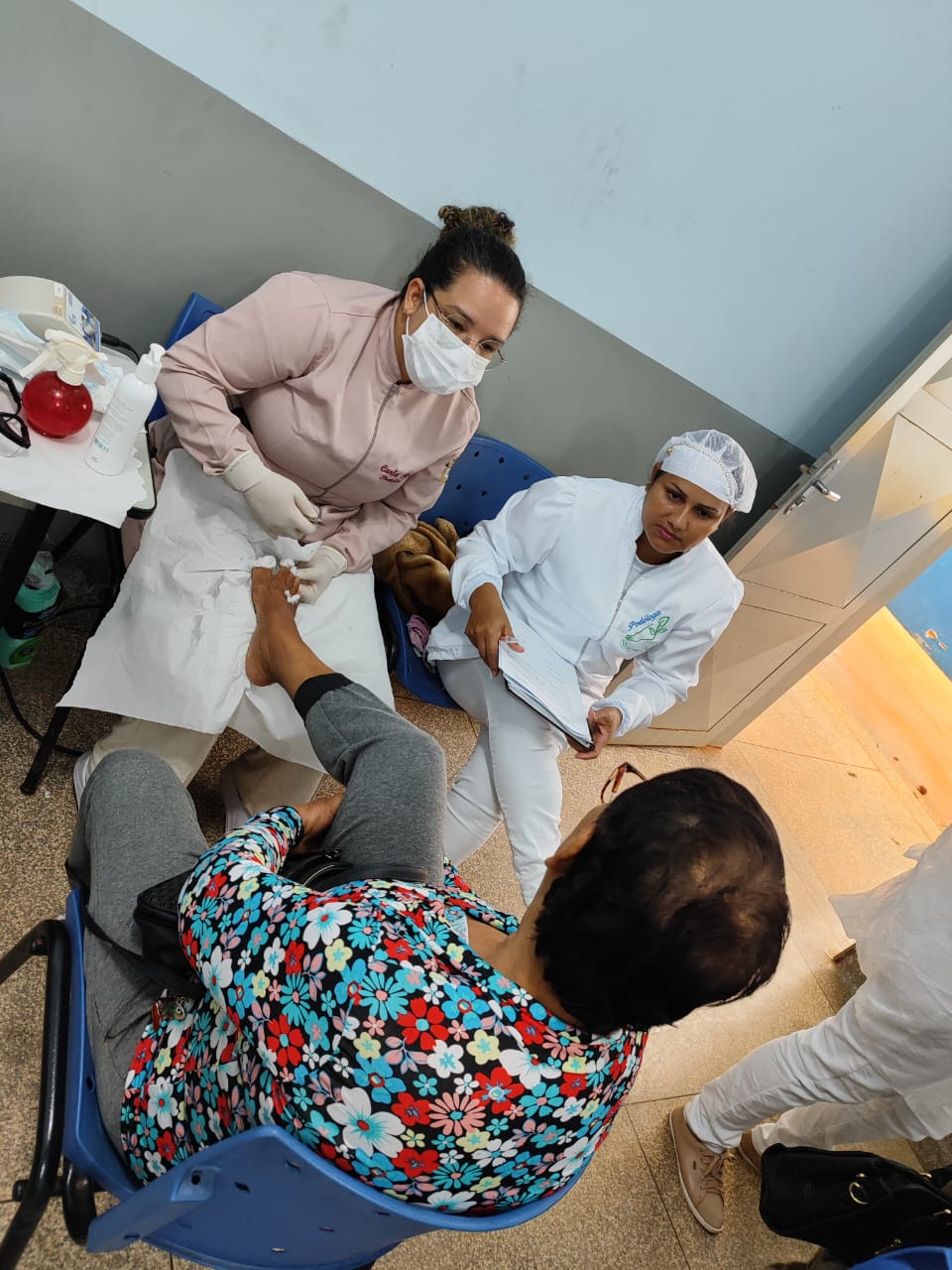 para atendimentos e movimentar a comunidade para participar. “A recepção foi ótima, fizemos uma pequena apresentação sobre a podologia e falamos sobre a importância dos cuidados com os pés. Os alunos estão muito satisfeitos com a ação, pois estão colocando em prática todos seus conhecimentos”, afirma Cristiane.