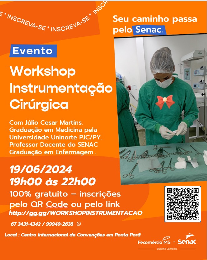 As inscrições podem ser realizadas no link: Microsoft Forms ou presencialmente no Senac, na Rua Sete de Setembro, 828, Centro. Mais informações pelo telefone (67) 3431-4342 ou pelo WhatsApp, no link: https://bit.ly/whatssenac