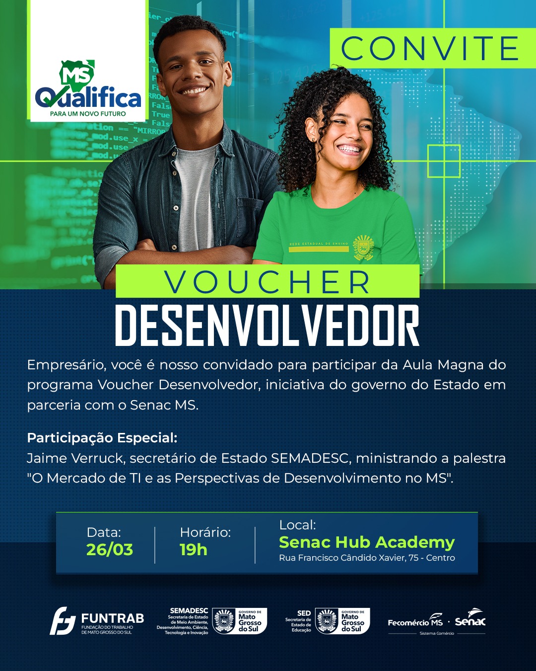 O secretário de estado de Desenvolvimento, Tecnologia e Inovação (Semadesc), Jaime Verruck, vai falar sobre as perspectivas de Mato Grosso do Sul e como o Programa Voucher Desenvolvedor se conecta a elas. Após a palestra será aberta uma roda de conversa entre os participantes. O evento será transmitido ao vivo para as demais escolas do interior do Estado, para que todas as turmas tenham acesso à palestra. Para conferir clique aqui..