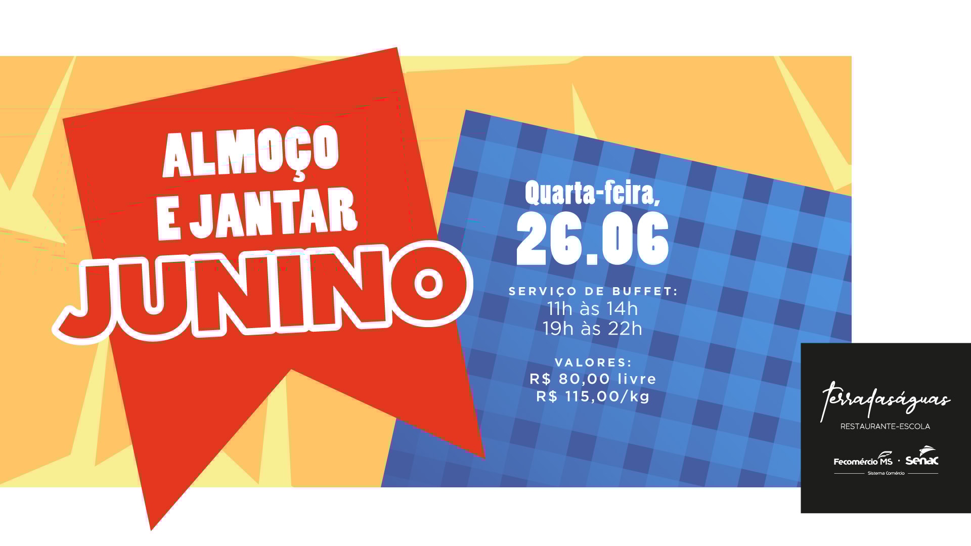 Com um menu especial, o restaurante-escola Senac terradaságuas, em Campo Grande, proporciona um dia de apreciação da gastronomia celebrada nas festividades juninas. Com destaque para aromas e cores, o jantar e almoço serão servidos no dia 26 de junho.