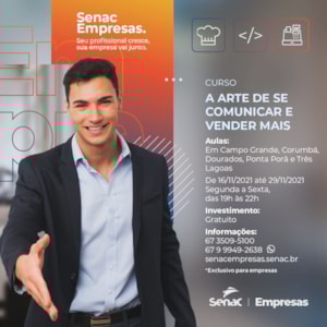 Em Mato Grosso do Sul, o Senac vai oferecer inicialmente o curso Arte de se Comunicar e de Vender Mais. As aulas têm início dia 16 de novembro e serão realizadas de forma presencial, de segunda a sexta-feira, das 19h às 22h, em todas as unidades do Senac no Estado. No curso, o Senac prepara empresas e profissionais para potencializar vendas, desempenho em equipe e resultados nos negócios.